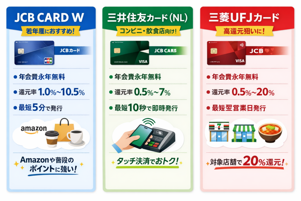 迷っている方は、まず基本還元率が高く汎用性のあるJCB CARD Wを1枚持っておき、コンビニや飲食店での還元を最大化したい場合は三井住友カード(NL)や三菱UFJカードをサブカードとして追加するのがおすすめの戦略です。