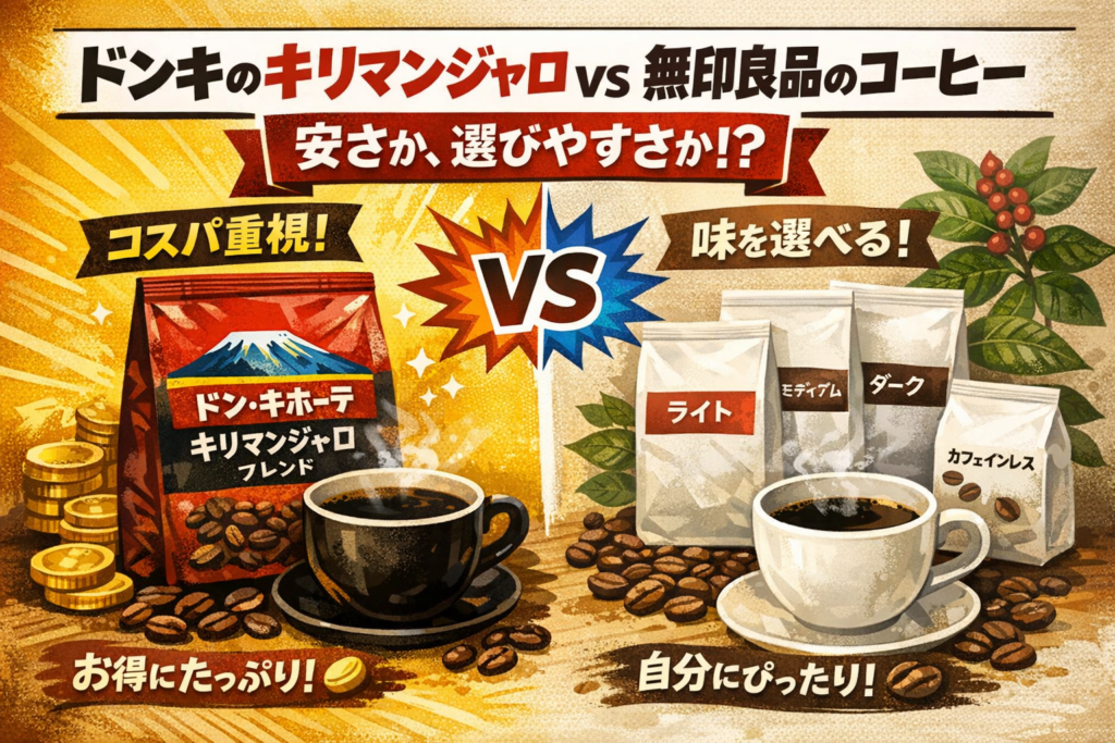 安くたっぷり飲みたいならドンキのキリマンジャロ寄り。味を失敗しにくく選びたいなら無印寄り。