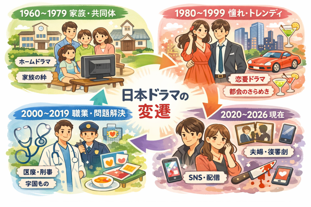 日本のドラマは、家族の規範を映すものから、恋愛と都会への憧れを売るものへ進み、さらに現実を処理する有能さを見せるものへ変わり、現在は感情を強く揺らしながら配信で追わせるものへ変質した。