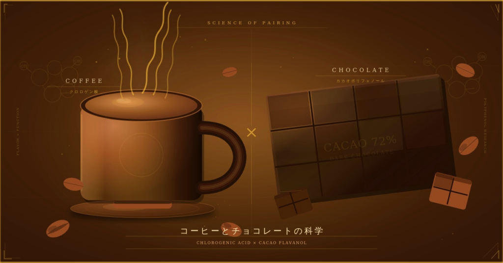 コーヒーにはクロロゲン酸をはじめとするポリフェノールが、チョコレートにはカカオフラバノールを中心とするカカオポリフェノールが含まれています。それぞれが血糖や血管に関わる可能性を持ち、「賢い間食」を考えたとき、この2つの組み合わせはかなり注目に値します。