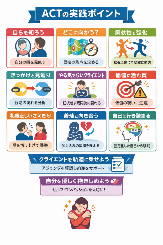 うまくいかないセッションを振り返り、自分のフュージョンと回避に気づき、セルフ・コンパッションを土台に関わり続ける——それがACTを持続可能な実践にする道です。